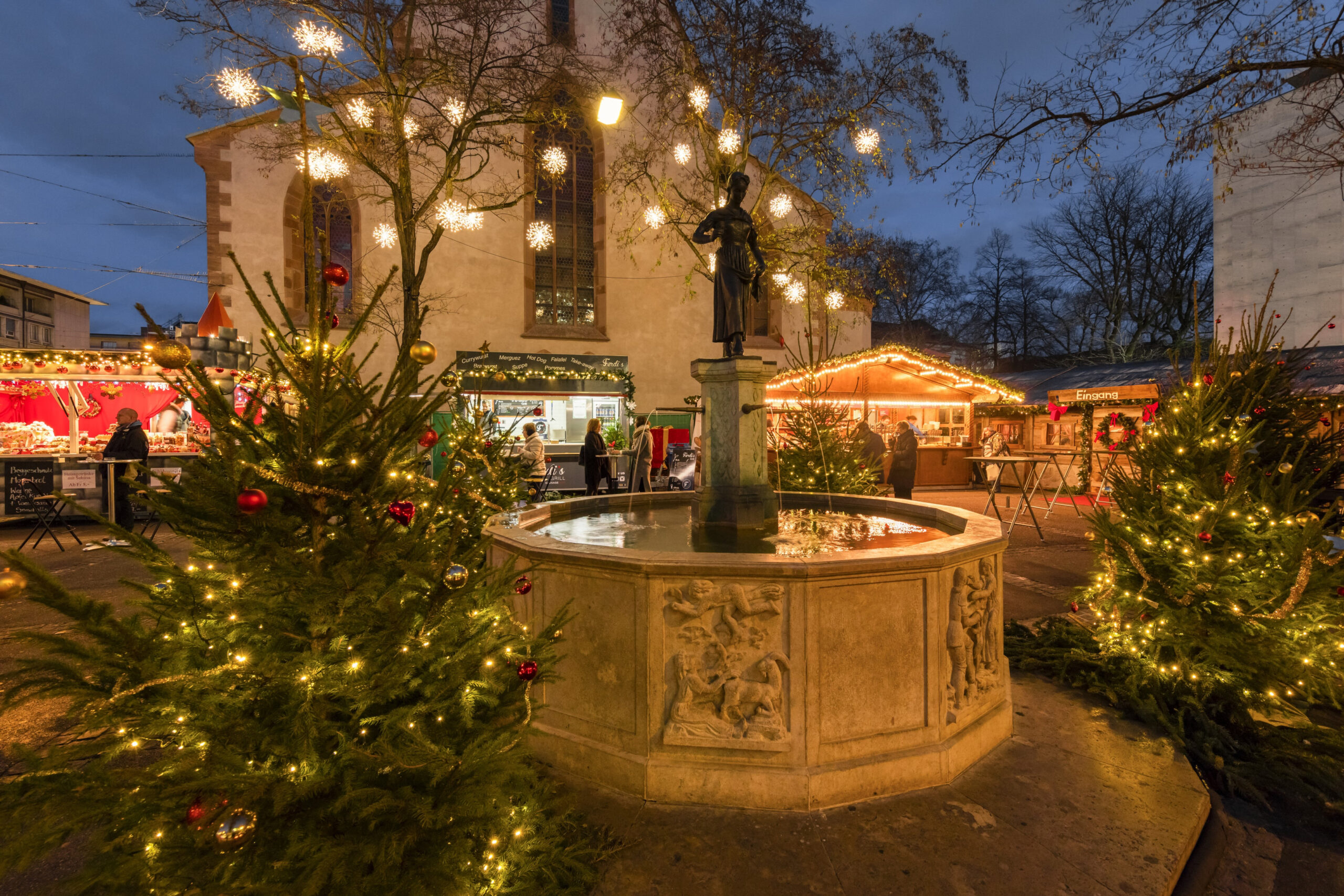 Η πόλη μας στον Ρήνο έχει μια πολύ ιδιαίτερη γοητεία την περίοδο των Χριστουγέννων. Η γραφική χριστουγεννιάτικη αγορά βρίσκεται στην Barfüsserplatz και στην Münsterplatz, ακριβώς στο κέντρο της πόλης και στην καρδιά της εορταστικά διακοσμημένης Παλιάς Πόλης. Ένα υπέροχο χριστουγεννιάτικο δέντρο βρίσκεται στην Münsterplatz, με στολίδια από τον γνωστό διακοσμητή Johann Wanner.
